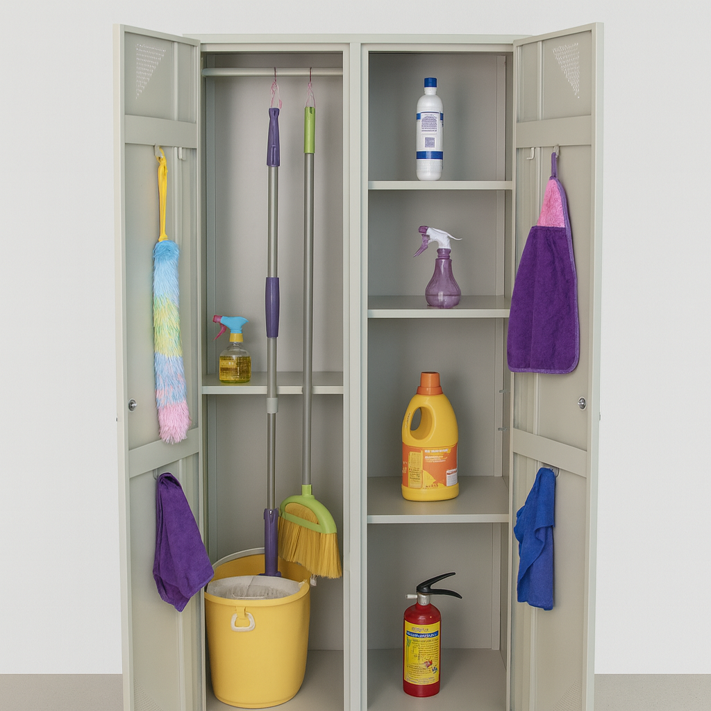 ✔ Ganchos internos: Ideal para colgar escobas, paños y utensilios de limpieza, facilitando el orden y el acceso rápido.