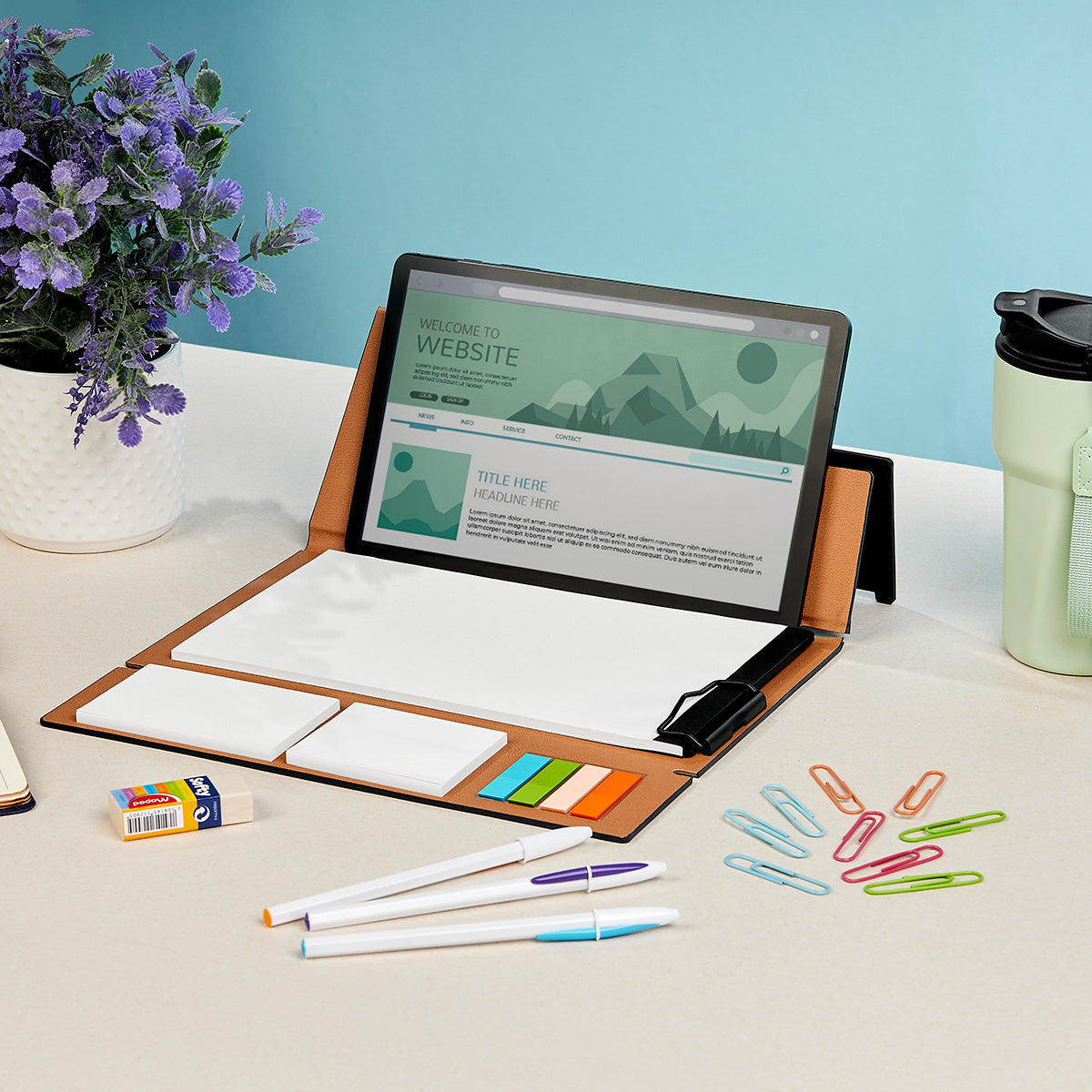 Su diseño plegable convierte la carpeta en un soporte ideal para tabletas o smartphones, brindando una solución práctica durante reuniones, clases o trabajo remoto.