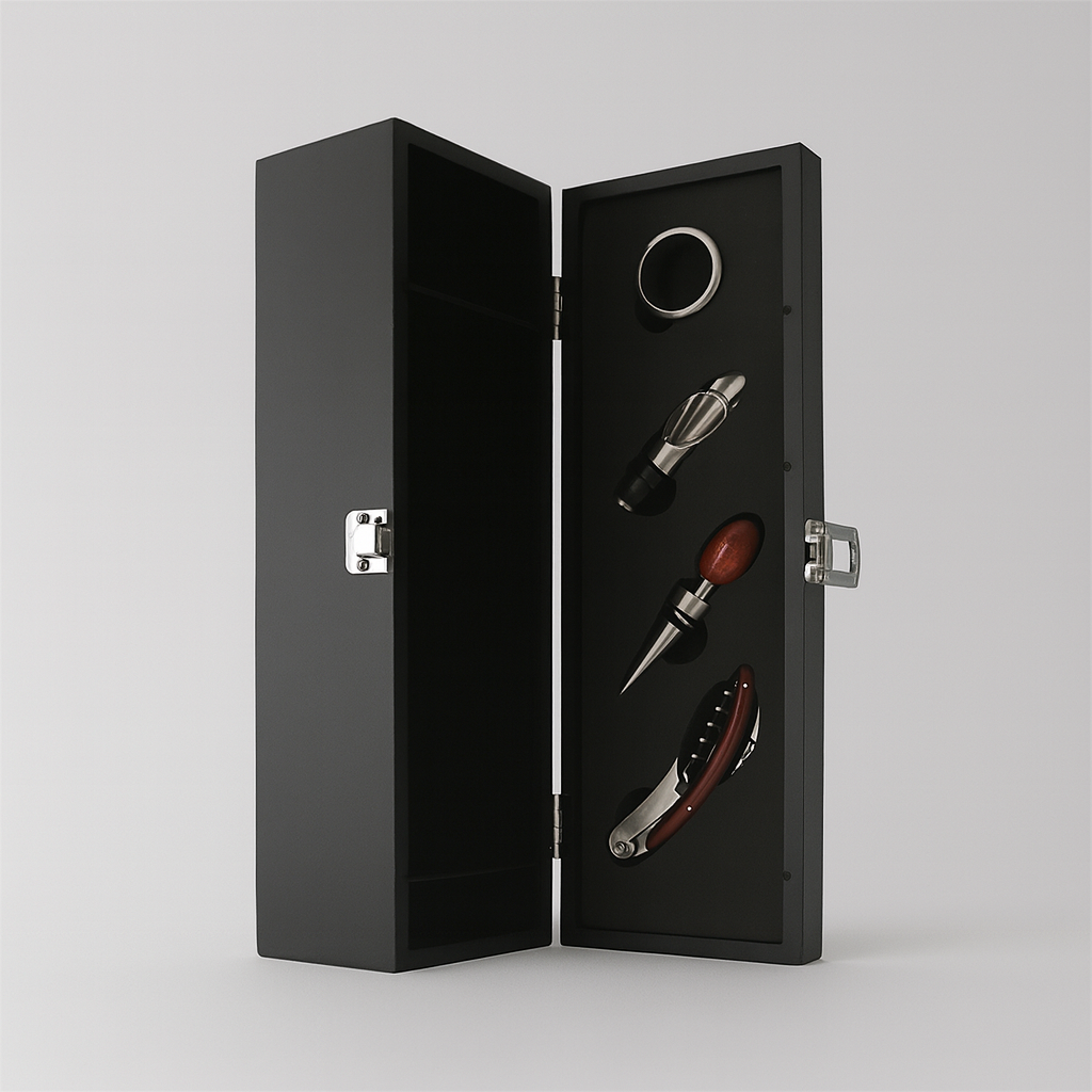 Este exclusivo Set para Vinos Cabernet es el regalo ideal para clientes, colaboradores o socios estratégicos. Combina funcionalidad y presentación impecable en un estuche sofisticado con acabado en madera, perfecto para sorprender en reuniones navideñas o eventos especiales.